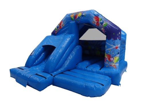 Our vibrant Celebrations Bouncy Castle with Front Slide! This eye-catching blue bouncy castle is adorned with festive fireworks, party balloons, and streamers artwork that will spark joy at any garden party!